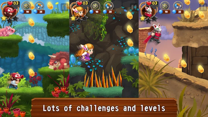 この壮大な旅には、それぞれに独自の魅力と特殊能力を持つ、4人の個性豊かなキャラクターたちが集結します。彼らのいずれかを選び、ダイナミックで洗練された新しいアクション体験を心ゆくまでご堪能ください。敵とのスリリングな攻防から、巧妙に隠されたギミックの解除まで、常に新鮮な驚きが満載です。各レベルの隅々まで探索し、隠された秘密の通路や、貴重な宝物を発見する喜びが、「スーパージャングルジャンプ」には溢れています。