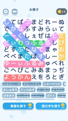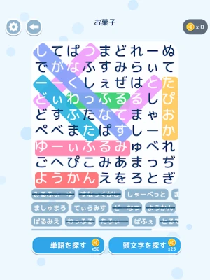 選んだテーマを元に、指で縦・横・斜めに文字をなぞって隠れた言葉を探し出すパズルゲーム。思考力を刺激し、時間を忘れて楽しめる文字探しです。